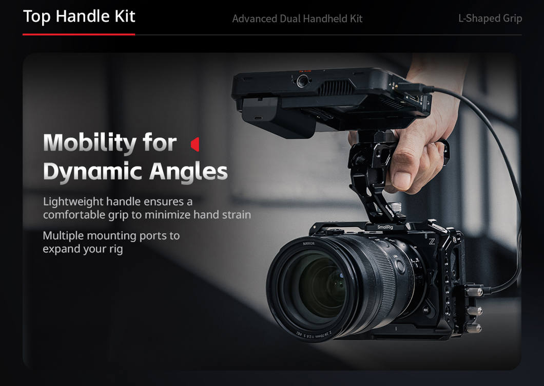 Praktiskt kit som kombinerar en SmallRig kamerabur med topphandtag – perfekt för handhållen filmning. Ger stabilitet, bekvämt grepp och många möjligheter att montera tillbehör.