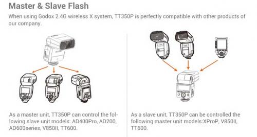 Godox TT3350 kan monteras i kamerans blixtsko eller användas bredvid kameran, som en slavblixt vid motivet och styras via det inbyggda radiosystemet. (Radiosändare ingår ej.). Blixten kan även användas som en Master-blixt och styra andra kompatibla blixtar via det inbyggda radiosystemet (Godox Wireless X).
