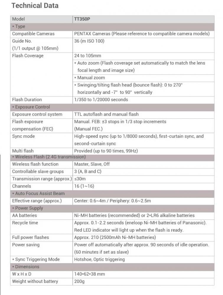GODOX TT350 är en ultramodern och mycket kompakt kamerablixt (för Ricoh GR och Pentax), med integrerat radiosystem (Godox Wireless X) och stöd för High Speed Sync (Slutartider upp till 1/8000s). Blixten avger en imponerande ljusmängd i förhållande till sin kompakta storlek och är samtidigt tillräckligt kompakt för att kunna tas med överallt. Blixten är föredömligt lätt att använda, med tydlig LCD-display och logiska reglage, som gör det lätt att växla mellan inställningarna. Kamerablixten kan användas med full automatik (Pentax TTL), helt manuellt eller med stroboskopfunktion (Multi) för att fånga ett snabbt förlopp. Stroboskopfunktion, som är inställbar i styrka, antal blixtar och frekvens, används för att avfyra en snabb serie av blixtar för att fånga t.ex ett snabbt händelseförlopp på en och samma bildruta. Det går t.ex att ställa in 20 st. blixtar i 99Hz!