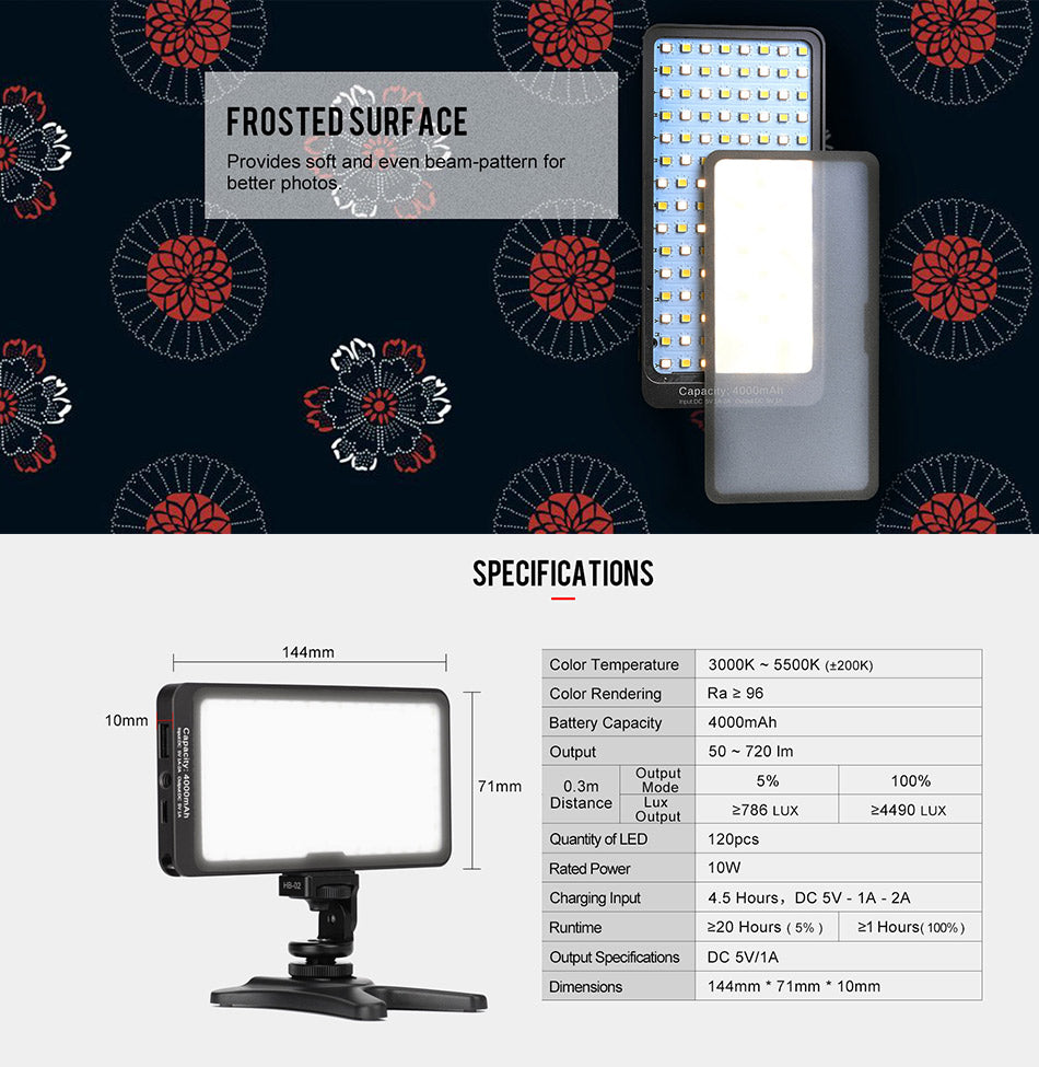 Tjockleken är bara 10mm och vikten på belysningen endast 170g. Belysningen drivs att ett integrerat och uppladdningsbart Li-On batteri på 4000 mAh, som kan driva belysningen på full effekt under en timme. Enheten fungerar även som en Powerbank och kan användas för att t.ex ladda en smartphone. LED-panelen består av 120 SMD-dioder, som avger ett flimmerfritt ljus på 4490 Lux på 30 cm!  Effekten är ställbar från 5% till 100% och har en ljusspridning på 120 grader.