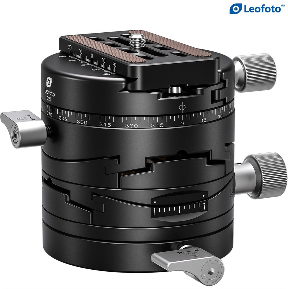 Det gör G20 lika användbart för panoramafotografering som för arkitektur-, landskaps- och produktfoto. Den 360° roterbara basen med lasergraverad skala och två inbyggda vattenpass gör det enkelt att jobba exakt, även i fält.