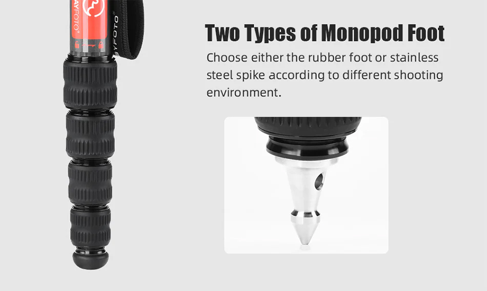 Sunwayfoto M3650C Carbon fiber monopod levereras med såväl gummi-fot som spikfot s k spike, Arca-fäste, handlovsrem och bärväska.