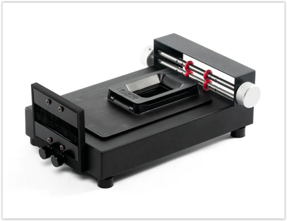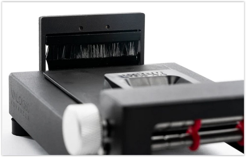VALOI Duster är kanske det mest populära tillbehöret till VALOI 360-systemet. Den har en aluminiumram, anodiserad och helt svart med en matt yta för att säkerställa att det inte finns några reflektioner. I den har vi satt två högkvalitativa borstar med antistatiska borstar som har extremt fina borst för att säkerställa att de inte repar film. Här får du den som en del av ett kit till ett bra pris!