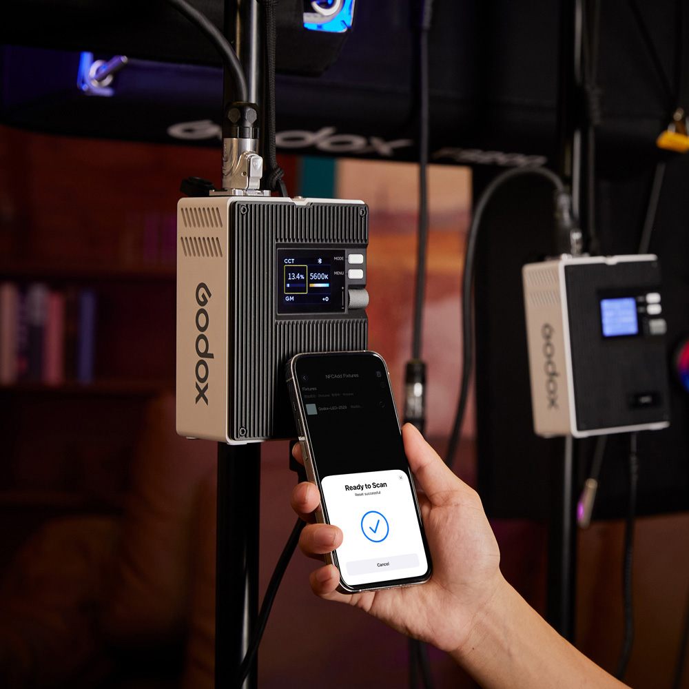 Styr belysningen enkelt med Godox Light App, med NFC-anslutning för snabb parkoppling och smidig integration. För mer avancerade uppsättningar stöder FL200R även DMX-styrning via den separat tillgängliga DMX-TRS1-adapterkabeln.