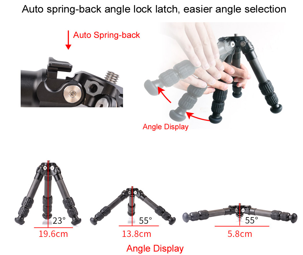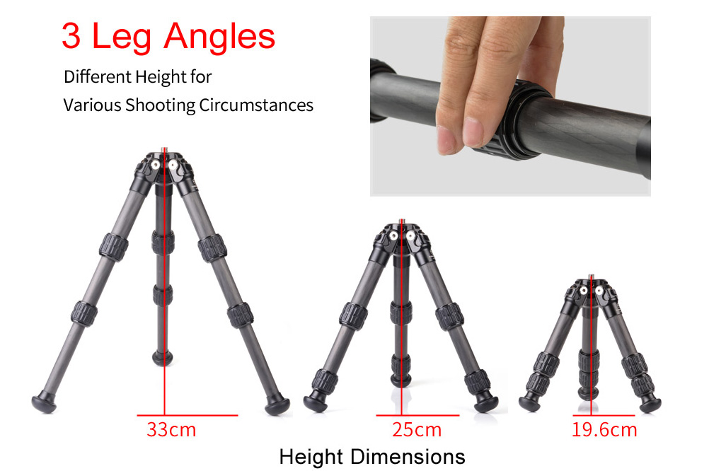 Stativbenen är utdragbara i tre bensektioner, med praktisk Twist-Lock låsning, vilket ger stativet en maxhöjd på 33 cm vid fullt utdrag och normal benvinkel. Stativet har ställbara benvinklar i tre olika vinklar, från spagat, halvspagat till normalläge. I spagat-läget så blir stativhöjden bara 6 cm över marknivån! Låsningen för benvinklarna har en smart Auto Spring-Back funktion, som gör det smidigt att snabbt ändra benvinkel på stativbenet. Dra låset rakt ut så att det klickar till och stannar i öppet läge. Ändra benvinkeln på benet och tryck till på låset så stängs det automatiskt.