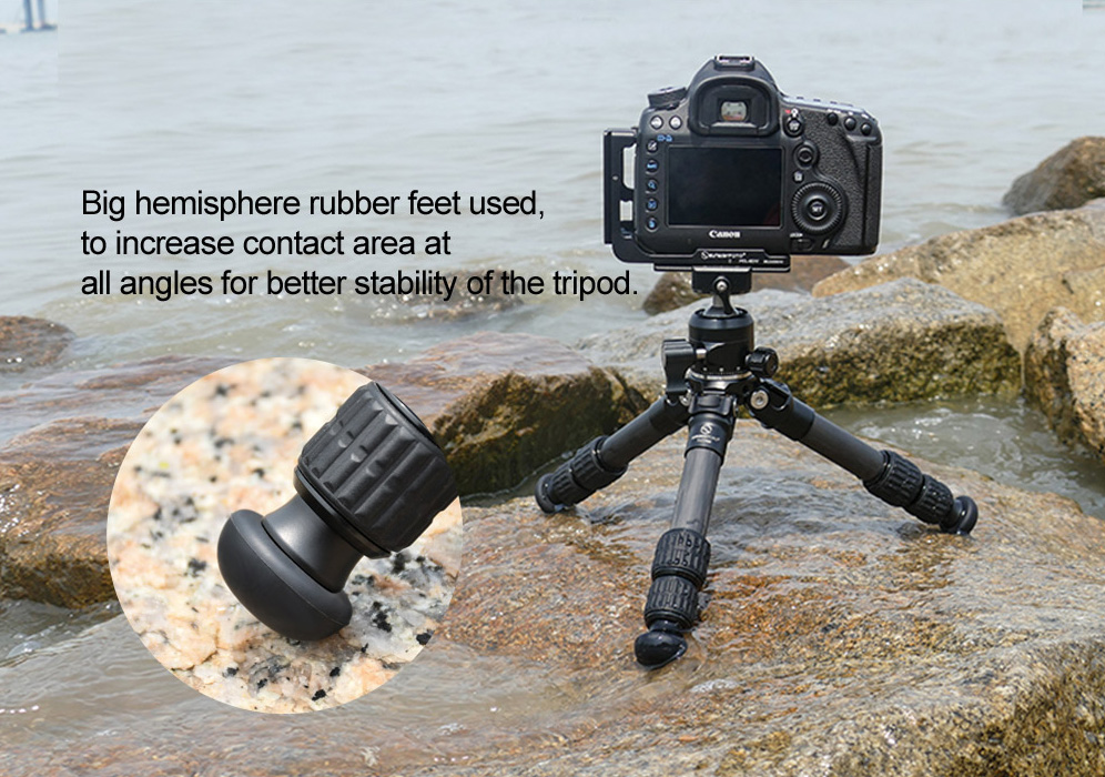 Sunwayfoto® T1C30N är försedda med stora, runda gummifötter, som ger bra greppförmåga både inom- som utomhus.Tack vare den runda formen på gummifötterna får stativbenen en bra anläggningsyta mot underlaget oavsett benvinkel. Stativet har en "2-i-1" skruv på ovansidan, med både 1/4" gänga och 3/8" gänga.