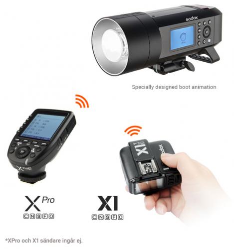 För att styra Godox Witstro AD400Pro, så krävs att man köper till en TTL-radiosändare, som man monterar i kamerans blixtsko. Sen kan man ändra blixtens inställningar direkt på sändaren (eller på många kameror även i kamerans menyer) för att styra blixten. På sändaren kan man t.ex växla mellan TTL-automatik, Manuellt eller Multi-läge. Om man har flera blixtar, som stödjer Wireless X, så kan man dela in blixtarna i olika grupper, som man sen kan styra individuellt från sändaren. Det är även möjligt att styra blixten från en App i sin iPhone/Android om man köper till en Godox A1 (Se underst). Radiosystemet har en räckvidd på upp till 100 meter.