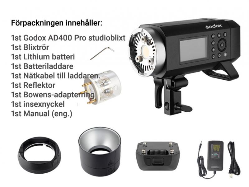 Godox Witstro AD400 PRO TTL är en professionell, kompakt studioblixt, med mycket snabba uppladdningstider och enastående prestanda. Tack vare snabba uppladdningstider så kan man hålla ett högt fotograferingstempo, utan risk för svarta bildrutor eller ojämnt exponerade bildserier. Blixten är designad för yrkesbruk och håller t.ex extremt jämn färgtemperatur över hela omfånget (Constant Color Mode) och hög repetitionsnoggrannhet. Godox Witstro AD400 PRO TTL har ett integrerat batteriaggregat och kan användas t.ex onlocation. Blixten har TTL-stöd för Canon (ETTL II) , Nikon(iTTL), Sony, Fuji och Olympus/Panasonic, samt stöd för t.ex Godox Wireless X och High Speed Sync (upp till 1/8000s).