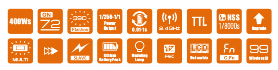 - Integrerat 2,4GHz Godox Radiosystem(TTL) för styrning av studioblixten.