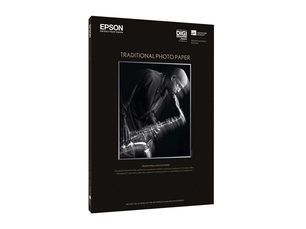 Epson Traditional Photo Paper är ett genombrott inom papperstillverkningen. Det har tagits fram speciellt för Epsons UltraChrome K3-bläck, och i samarbete med många ledande proffsfotografer i branschen för att säkerställa att det uppfyller deras höga krav. Många som har bidragit till utvecklingen av Traditional Photo Papers märkte att det påminde dem om det uppskattade silverhaloidmediet och som möjliggjorde stor kreativ kontroll tack vare det ovanligt höga D-Max och nyansåtergivningen i svartvitt.