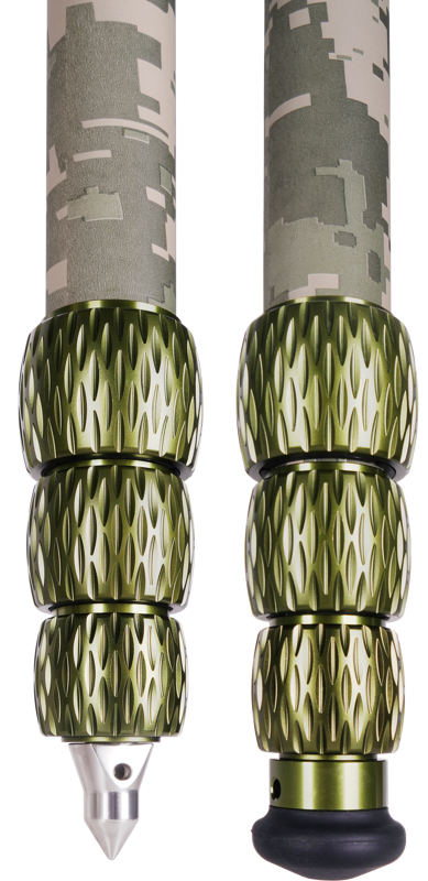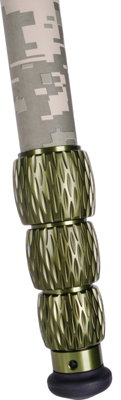 Det digitala kamouflagemönstret gör stativet praktiskt taget osynligt i vildmarken. Detta stativ har även vridlås gjorda i metall med matt grön färg. Stativet har en maximal höjd på 150 cm (+ huvud) och en minimal höjd på 12 cm, vilket gör att du kan fotografera i många olika vinklar och positioner.