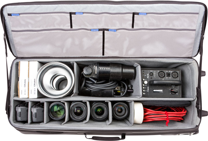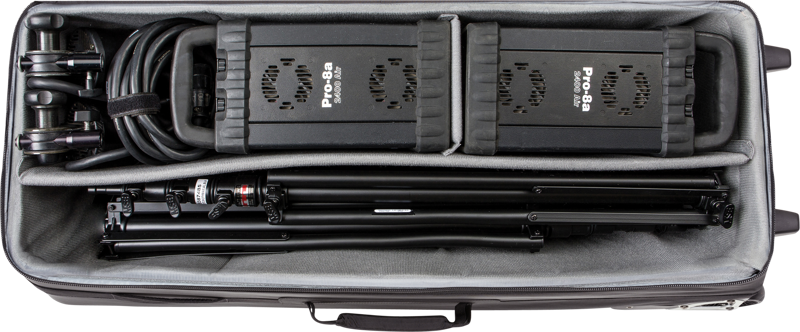 Professionals will appreciate the robust design of this large roller with room for C-stands, multiple flash heads, power packs, monoblocks, softboxes, and light stands.