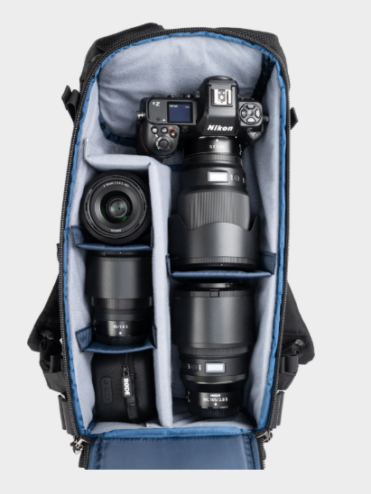 - Justerbara avdelare rymmer stora teleobjektiv, traditionell fotoutrustning eller personliga föremål