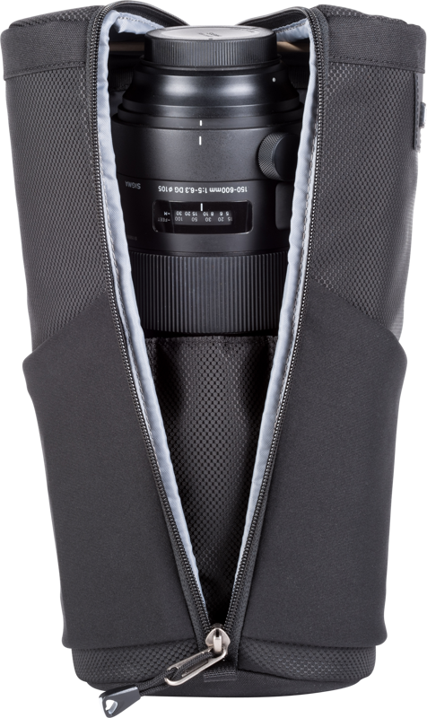 Den modulära påsen rymmer ett 150–600 mm f/ 5– 6.3-objektiv med huvan omvänd