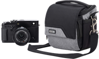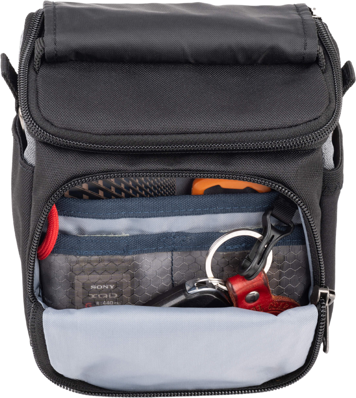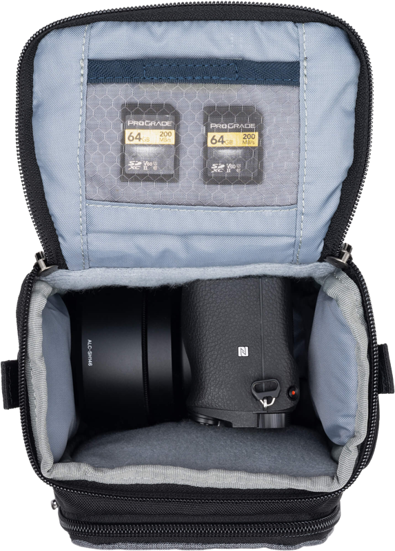 VAD FÅR PLATS I DEN HÄR VÄSKAN? Passar en liten till medelstor pek-och-skjutkamera eller ett litet spegellöst kamerahus med ett litet teleobjektiv, pannkaksobjektiv eller ett litet ljusstarkt objektiv.