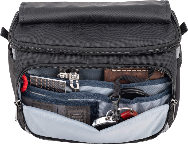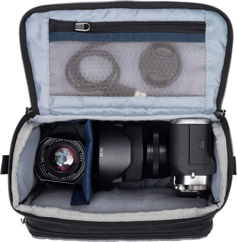 VAD FÅR PLATS I DEN HÄR VÄSKAN? Passar ett standard spegelfritt kamerahus plus 1 till 2 objektiv: korta till medellånga f/4-zoomar eller korta till medellånga fasta objektiv.