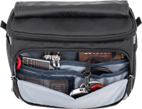 - Lättåtkomlig dimensionerad ficka med dragkedja framtill och tillbehörsorganizer