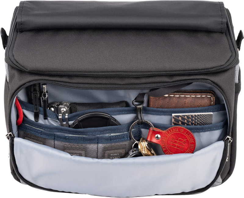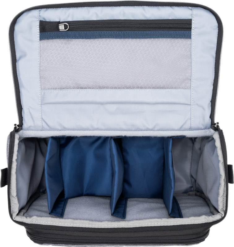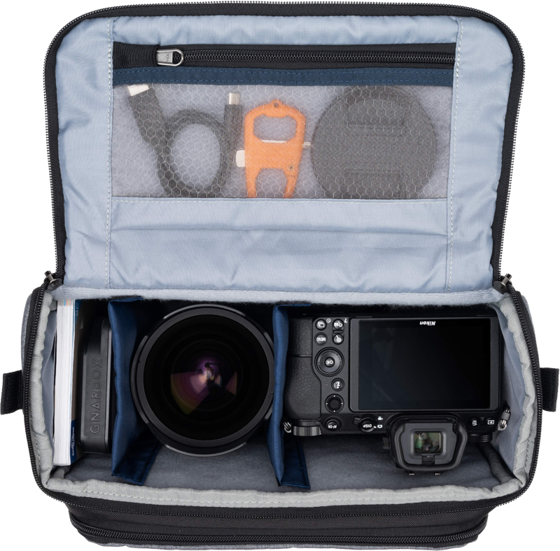 VAD FÅR PLATS I DEN HÄR VÄSKAN? Passar ett spegelfritt standardhus plus 2 till 4 objektiv: korta till medellånga f/4- och f/2,8-zoomar eller korta till medellånga ljusstarka objektiv.