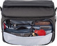 - Lättåtkomlig dimensionerad ficka med dragkedja på framsidan och tillbehörsorganizer